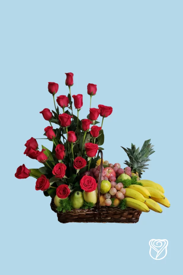 Arreglo con flores y frutas esta compuesto por: